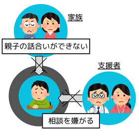 お子さん自身もご家族も困っているが、親子間の対話が難しい。支援機関への相談もできないため、支援が始まらない。